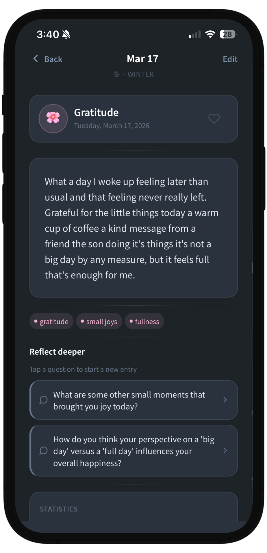 毎日のエントリーが穏やかなAI分析を起動します — スコアでも生産性指標でもなく、あなたが生きている感情の風景を映し出すもの。