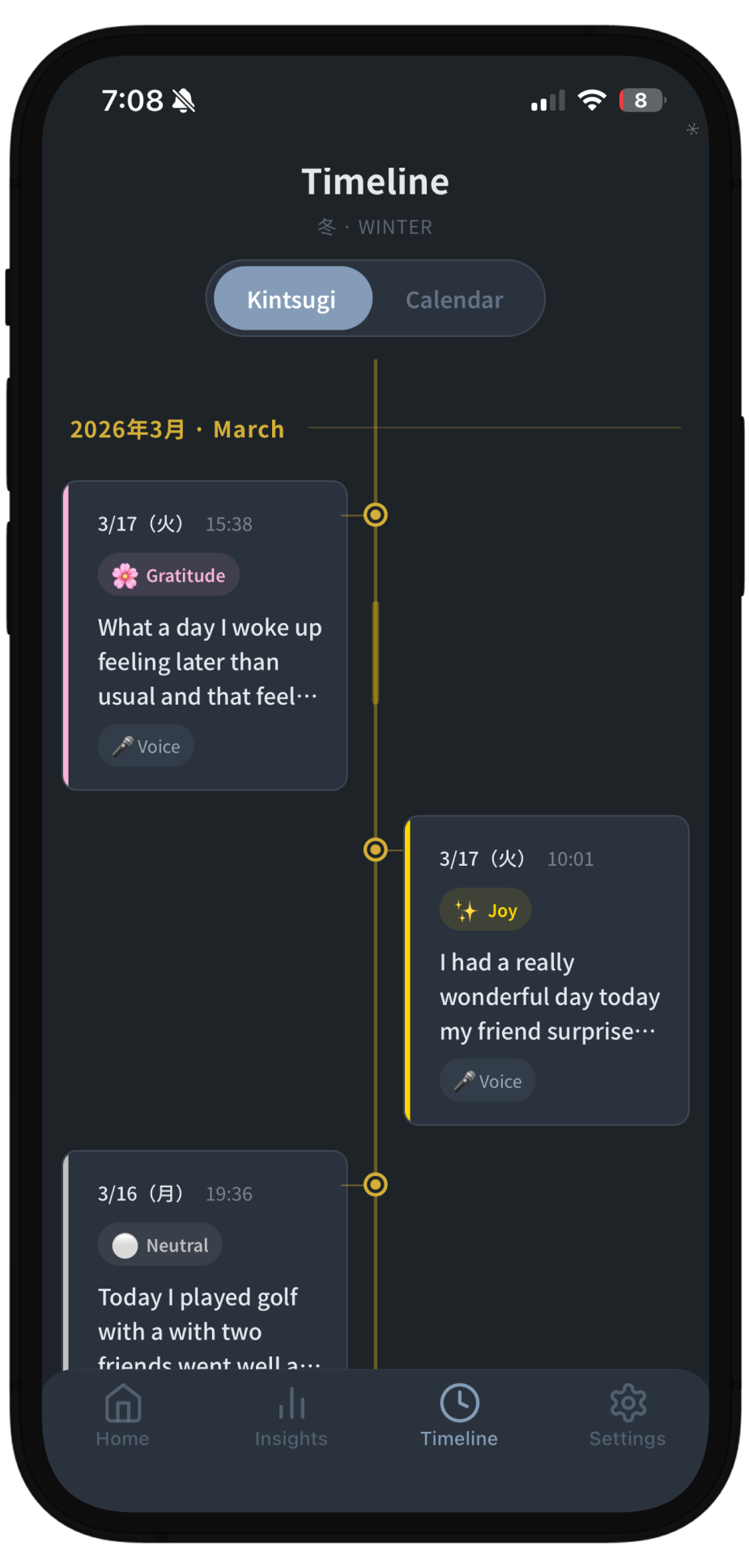 すべてのエントリーがあなたの物語の一瞬です。タイムラインは金の糸でそれらを繋ぎます — 困難な瞬間ほど、修復がより美しく輝きます。